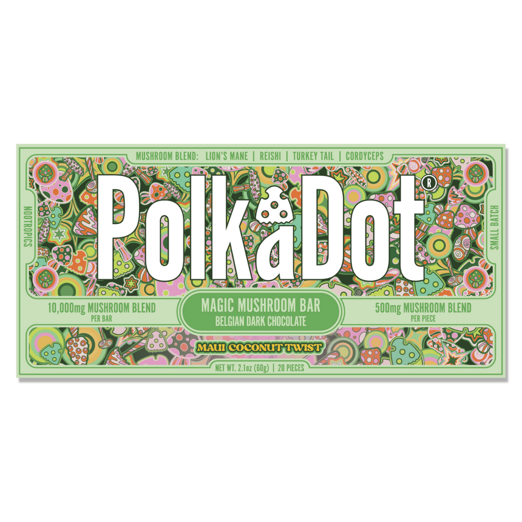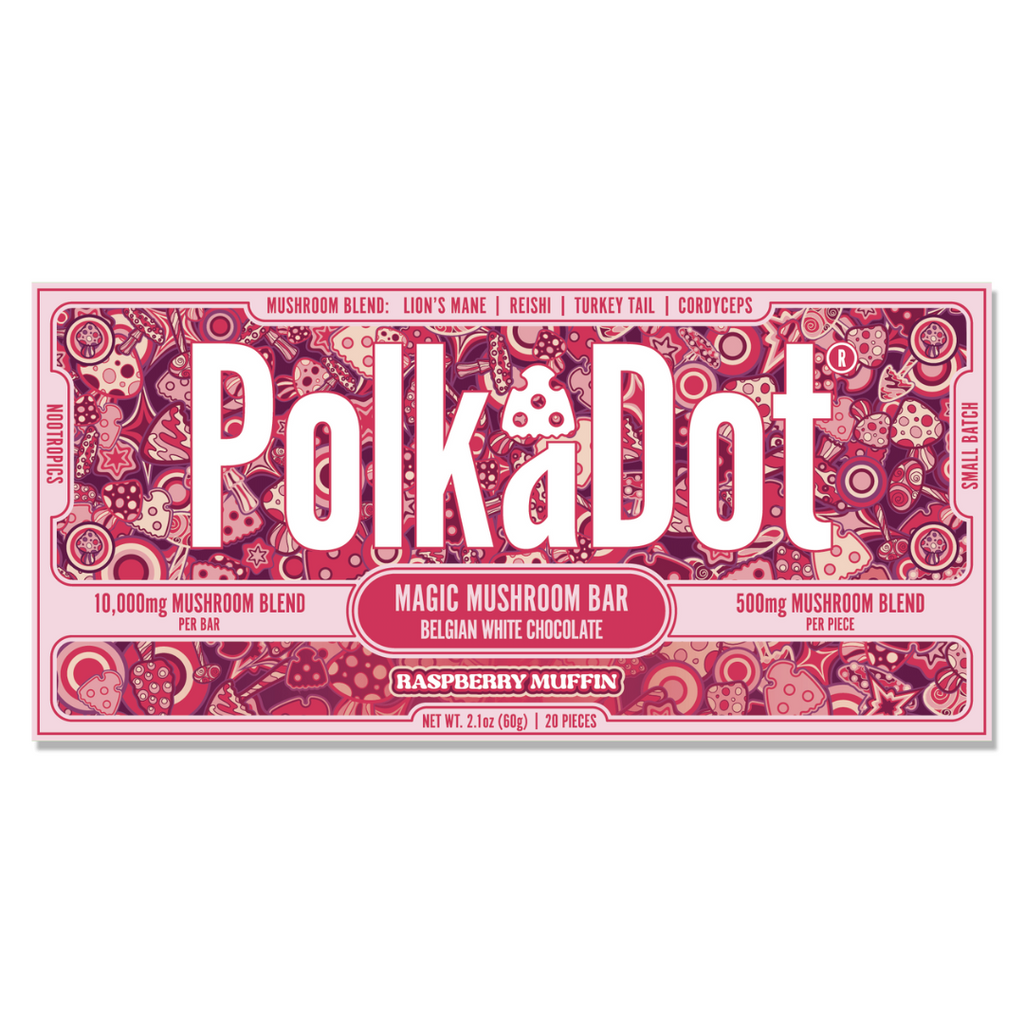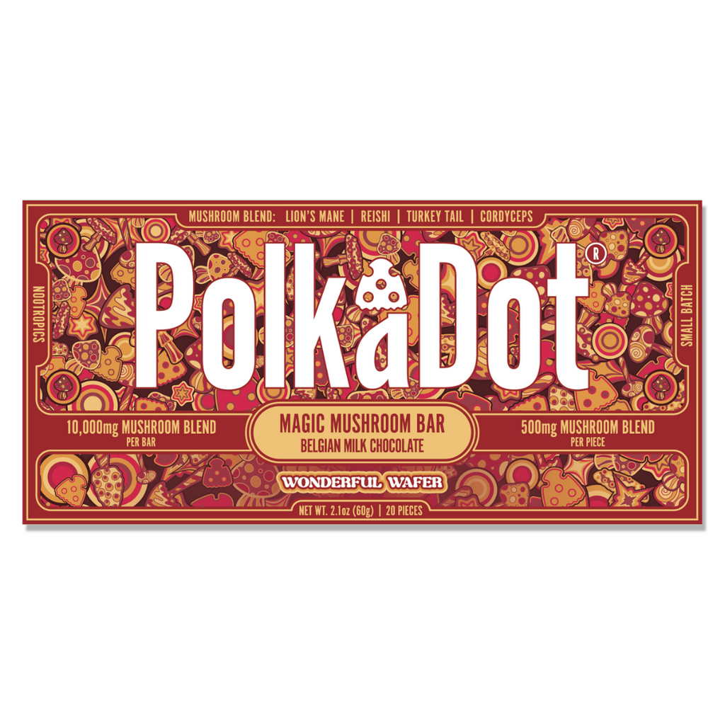 The PolkADot Magic Mushroom Bar is a powerhouse edible, delivering 10,000mg of a proprietary mushroom extract blend per bar. Made with rich milk chocolate or smooth white chocolate, each bar comes in one of 22 delicious flavors that set a new standard for variety and taste. 100% legal and crafted for potency, these bars provide a strong and memorable psychedelic experience. Sold in 10-count display cases – a must-have for shops looking to stock one of the most sought-after mushroom chocolates on the market.